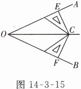 1. 如图 14 - 3 - 15,将两个完全相同的直角三角尺按如图所示的方式放置,使得顶点 $ C $ 重合,$ \angle OEC = \angle OFC = 90^{\circ} $,若 $ \angle AOC = 25^{\circ} $,则 $ \angle OCF $ 的度数是( )
