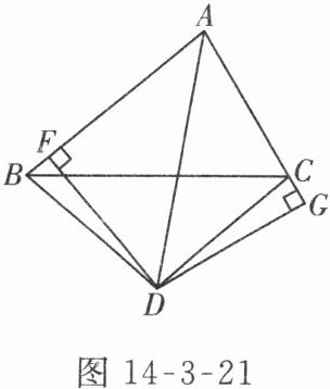 7. 如图 14 - 3 - 21,在 $ \triangle ABC $ 中,$ DF \perp AB $,垂足为 $ F $,$ DG \perp AC $,交 $ AC $ 的延长线于点 $ G $,$ DB = DC $,$ BF = CG $。求证:$ AD $ 平分 $ \angle BAC $。