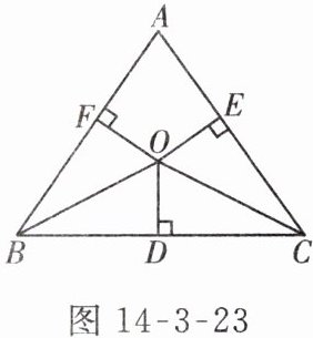 2. 如图 14 - 3 - 23,$ O $ 是 $ \triangle ABC $ 内一点,且点 $ O $ 到三边的距离 $ OF = OD = OE $,若 $ \angle BAC = 70^{\circ} $,则 $ \angle BOC = $______。