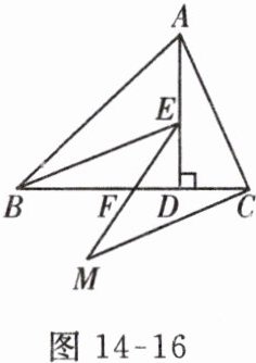 13. 如图 14 - 16,在锐角三角形 $ABC$ 中,$AD\perp BC$ 于点 $D$,点 $E$ 在 $AD$ 上,$DE = DC$,$BE = AC$,$F$ 为 $BC$ 的中点,连接 $EF$ 并延长至点 $M$,使 $FM = EF$,连接 $CM$。求证: