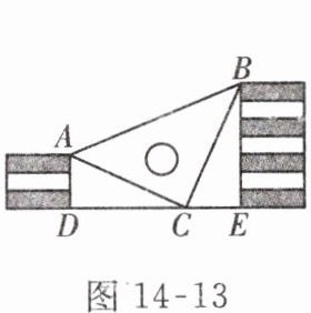10. 如图 14 - 13,小虎用 $10$ 块高度都是 $3cm$ 的相同长方体小木块,垒了两堵与地面垂直的木墙,木墙之间刚好可以放进一个等腰直角三角板($AC = BC$,$\angle ACB = 90^{\circ}$),点 $C$ 在 $DE$ 上,点 $A$ 和点 $B$ 分别与木墙的顶端重合,则两堵木墙之间的距离为 ______ $cm$。