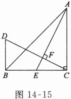 12. 如图 14 - 15,在 $\triangle ABC$ 中,$\angle ACB = 90^{\circ}$,$AC = BC$,$AE$ 是 $BC$ 边的中线,过点 $C$ 作 $CF\perp AE$,垂足为 $F$,过点 $B$ 作 $BD\perp BC$ 交 $CF$ 的延长线于点 $D$。
