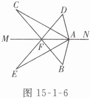 7. 如图 15-1-6,$\triangle ABC和\triangle ADE关于直线MN$对称,$BC与DE的交点F在直线MN$上.