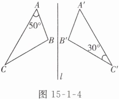 5. 如图 15-1-4,$\triangle ABC与\triangle A'B'C'关于直线l$对称,$\angle A = 50^{\circ}$,$\angle C'= 30^{\circ}$,则$\angle B$的度数为______.