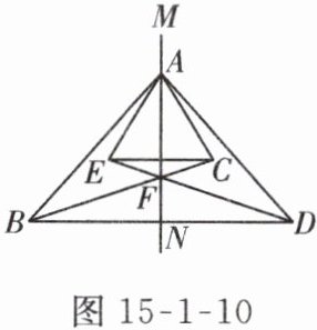 5. 如图 15-1-10,$\triangle ABC和\triangle ADE关于直线MN$对称,$BC和DE的交点F在直线MN$上.