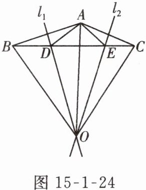 6. 如图15-1-24,在△ABC中,AB的垂直平分线$l_{1}$交BC于点D,AC的垂直平分线$l_{2}$交BC于点E,$l_{1}与l_{2}$相交于点O,△ADE的周长为6.