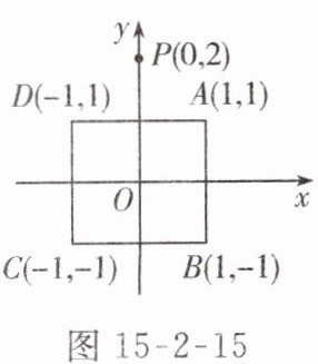 2. 如图 15-2-15,在平面直角坐标系中,正方形 $ ABCD $ 的顶点坐标分别为 $ A(1,1),B(1,-1),C(-1,-1),D(-1,1) $,$ y $ 轴上有一点 $ P(0,2) $。作点 $ P $ 关于点 $ A $ 的对称点 $ P_1 $,作点 $ P_1 $ 关于点 $ B $ 的对称点 $ P_2 $,作点 $ P_2 $ 关于点 $ C $ 的对称点 $ P_3 $,作点 $ P_3 $ 关于点 $ D $ 的对称点 $ P_4 $,作点 $ P_4 $ 关于点 $ A $ 的对称点 $ P_5 $,作点 $ P_5 $ 关于点 $ B $ 的对称点 $ P_6 … … $ 按此操作下去,则点 $ P_{2011} $ 的坐标为( )