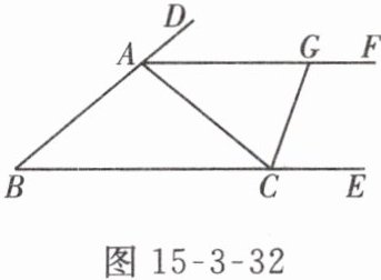 7. 如图15-3-32所示,已知点$D$,$E分别是\bigtriangleup ABC的边BA和BC$延长线上的点,作$\angle DAC的平分线AF$,若$AF // BC$。