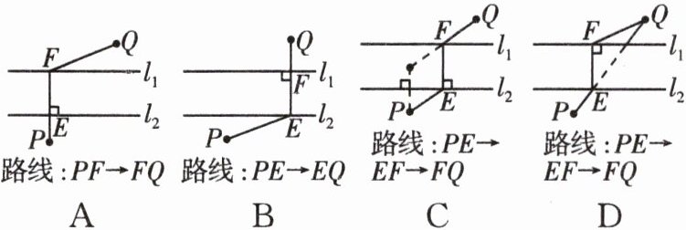 6. 直线 $ l_1 $,$ l_2 $ 表示一条河的两岸,且 $ l_1 // l_2 $. 现要在这条河上建一座桥(桥与河的两岸相互垂直),使得从村庄 $ P $ 经桥过河到村庄 $ Q $ 的路程最短,应该选择路线( )
