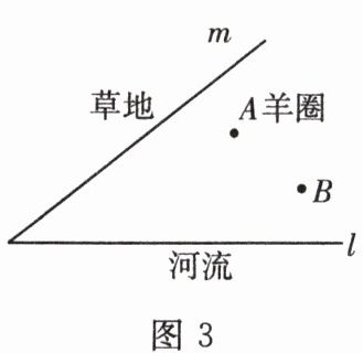 4. 如图 3,牧羊人从羊圈 $ A $ 出发,先让羊群在草地 $ m $ 上吃草,再让羊群去河流 $ l $ 处饮水,再将羊群带到点 $ B $ 处休息. 请你帮牧羊人确定最短的出行路线.