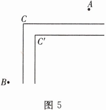 7. 如图 5 所示,某条护城河在 $ CC' $ 处直角转弯,河宽相同,从 $ A $ 处到达 $ B $ 处,须经过两座桥(桥宽不计,桥与河垂直),设护城河以及两座桥都是东西、南北走向的,恰当地造桥可使 $ A $ 到 $ B $ 的路程最短,请确定两座桥的位置.