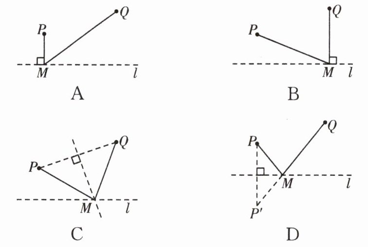 1. 直线 $ l $ 是一条河,$ P $,$ Q $ 是两个村庄. 计划在 $ l $ 上的某处修建一个水泵站 $ M $,向 $ P $,$ Q $ 两地供水. 现有如下四种铺设方案(图中实线表示铺设的管道),则所需管道最短的是( )