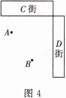 5. 如图 4,阳光明媚的周六,小明在学校($ A $)练习篮球,他接到妈妈的电话,要先去 $ C $ 街快递公司取包裹,再去 $ D $ 街购买文具,然后回到家里($ B $). 若小明走的恰好是最短路径,请画出小明行走的最短路径.
