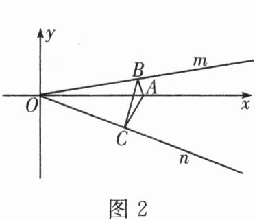 3. 唐诗《古从军行》中“白日登山望烽火,黄昏饮马傍交河”,隐含了一个有趣的数学问题——“将军怎样走才能使总路程最短”?如图 2 所示,在平面直角坐标系中,将军从 $ A(4,0) $ 出发,先到山脉 $ m $ 的任意位置望烽火,再到河岸 $ n $ 的任意位置饮马后返回到 $ A $ 点,且 $ m $ 与 $ n $ 的夹角为 $ 30^{\circ} $,则将军所走的最短总路程为( )