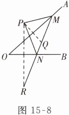 8. 如图15-8,P是∠AOB外的一点,M,N分别是∠AOB两边上的点,点P关于OA的对称点Q恰好落在线段MN上,点P关于OB的对称点R落在MN的延长线上.若PM= 3.5cm,PN= 4cm,MN= 5cm,则线段QR的长为______.