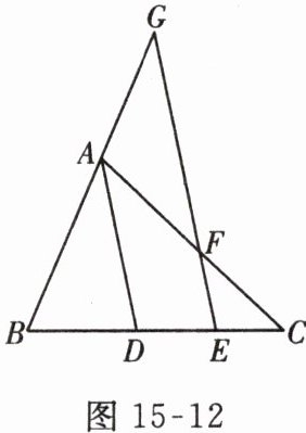 12. 如图15-12所示,在△ABC中,AD平分∠BAC,过线段CD上一点E作EG//AD,交AC于点F,交BA的延长线于点G.