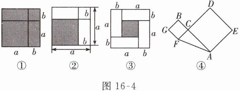 (1)请写出通过求图 16 - 4①、图 16 - 4②阴影部分的面积分别能解释的乘法公式: