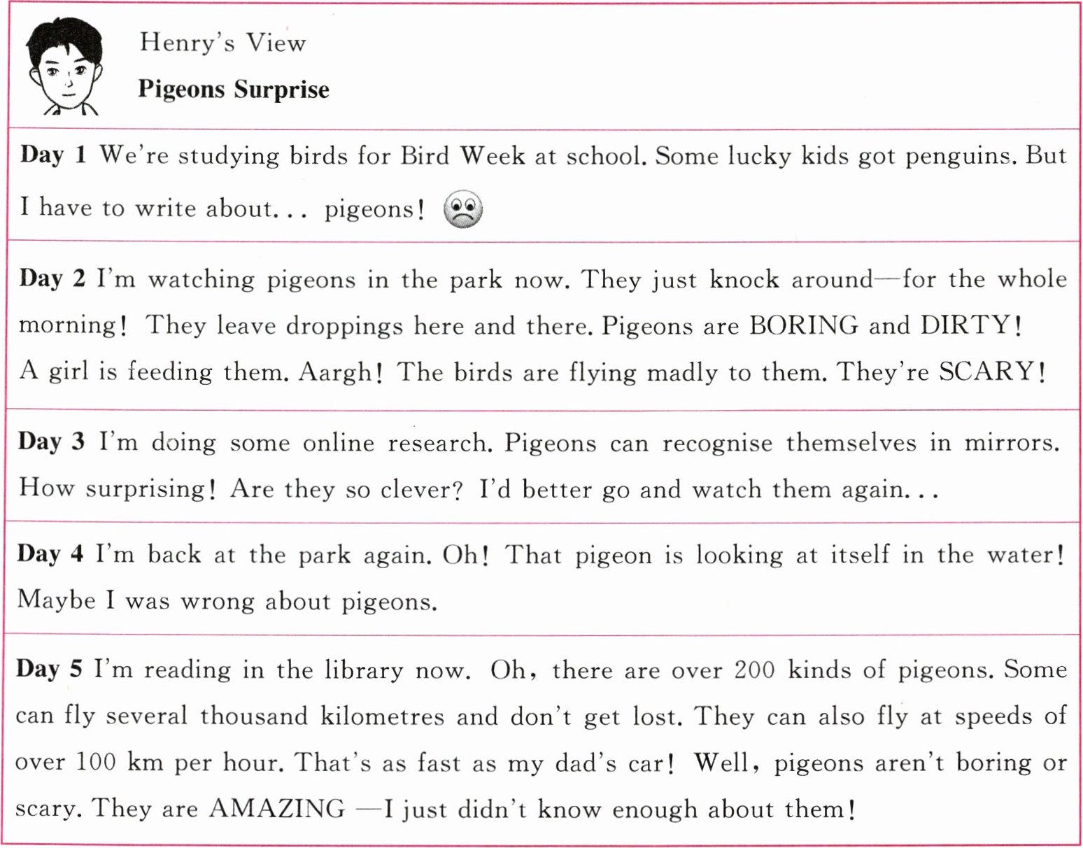 Day 5 I’m reading in the library now. Oh, there are over 200 kinds of pigeons. Some can fly several thousand kilometres and don’t get lost. They can also fly at speeds of over 100 km per hour. That’s as fast as my dad’s car! Well, pigeons aren’t boring or scary. They are AMAZING —I just didn’t know enough about them!