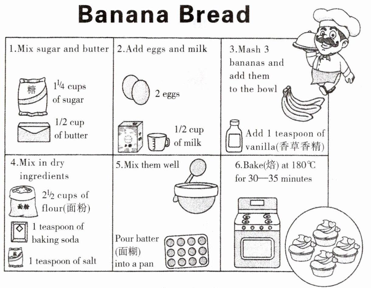 Tom plans to make some banana bread for his family. And here is the recipe.