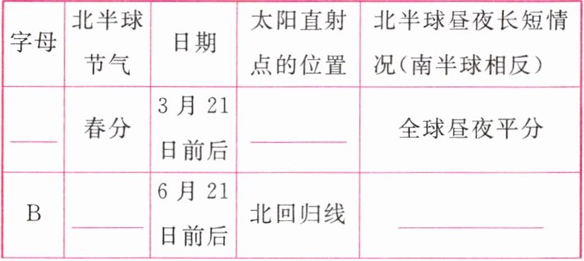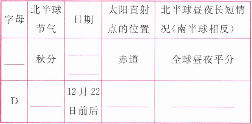 |字母|北半球节气|日期|太阳直射点的位置|北半球昼夜长短情况(南半球相反)|