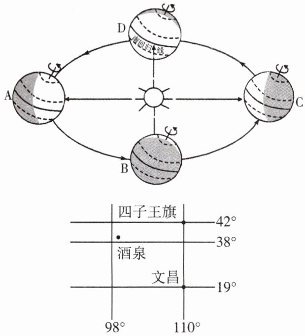 2020 年 11 月 24 日,我国在文昌成功发射嫦娥五号探测器,返回器于 12 月 17 日携带月球样品在内蒙古中部四子王旗着陆,地外天体采样返回任务圆满完成。读“发射场和着陆场经纬度位置图”及“地球公转示意图”,完成 5~7 题。