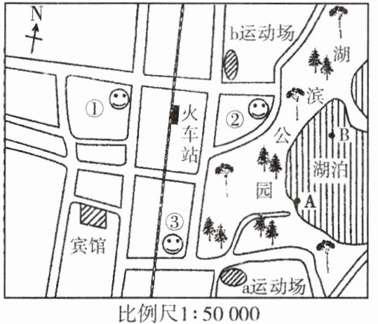 (3)三位同学相约在湖泊西北方向的运动场附近集合,这个运动场指的是