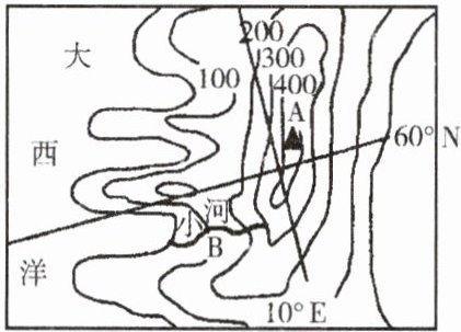 12. 读“世界某地区等高线图”,山脉 A 在小河 B 的什么方向(