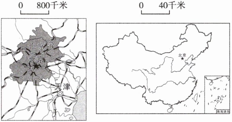 (1)北京市地图的比例尺应是![img alt=0-40千米],中国地图的比例尺应是![img alt=0-800千米]。