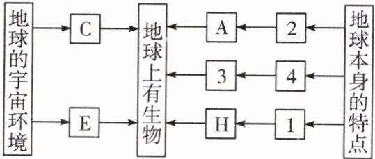 (2)到目前为止,人类还没有发现除地球以外存在生命的星球。地球上存在生命的原因包括地球宇宙环境条件和自身条件。请帮助该同学按照相互关系,将下面剩余条件按照数字序号填在横线上,完成思维导图。