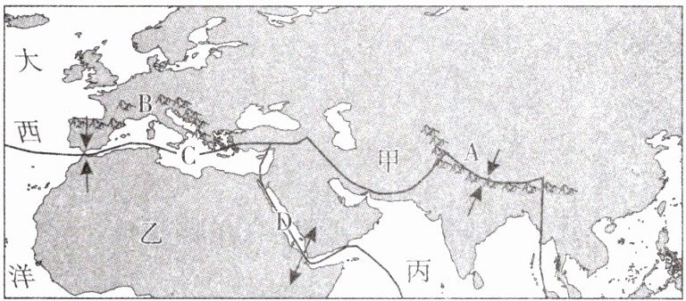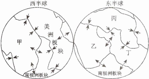 8. 下图为“全球六大板块分布示意图”,甲、乙、丙、丁四个板块中,示意亚欧板块的是(
