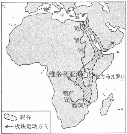 读“东非大裂谷示意图”,并运用板块学说知识回答6~7题。