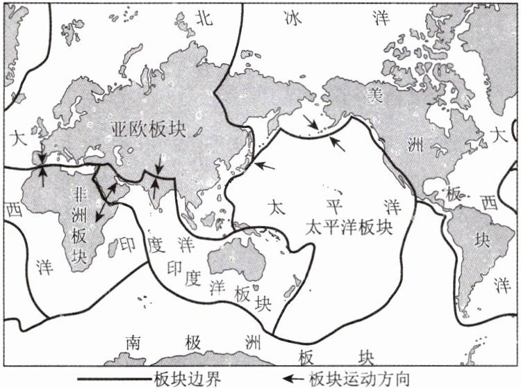 (3)大体一致;高山的形成一般是板块碰撞挤压形成的。 点拨:本题考查的主要知识点是两大火山、地震带与板块运动的关系。世界主要火山、地震带集中分布在板块交界的地带。