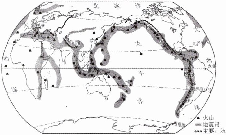 10. 读“世界主要火山、地震带的分布图”,回答下列问题。