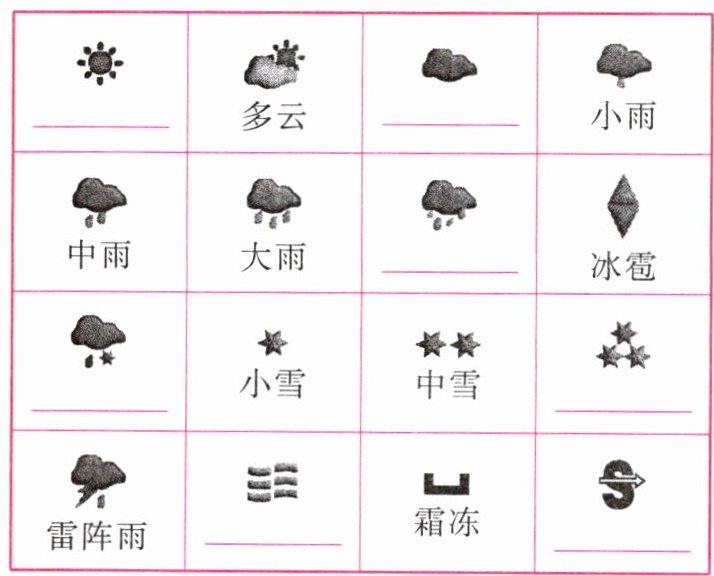 1.阴晴 气温 降水 2.从左往右,从上至下:晴 阴 暴雨 雨夹雪 大雪 雾 沙尘暴