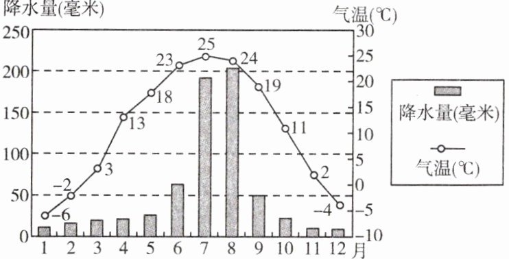 7. 下图表示我国某市多年平均气候资料。该市气温年较差约为(