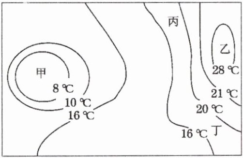 4. C 点拨:在同一幅等温线图上,相邻的等温线之间的温差相等。因为图上温度数据只有两个地方不正确,所以可以判断此图中相邻两条等温线的温差应该是4°C。 5. A 点拨:如果中心位置的气温比周围气温高,则该中心是高温中心;反之,是低温中心。甲地的气温比周围的气温低,所以是低温中心;乙地的气温比周围的气温高,所以是高温中心。