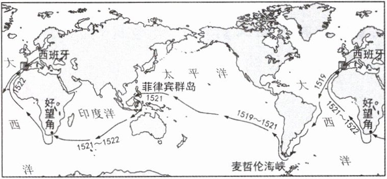 材料二 1519-1522年,葡萄牙航海家麦哲伦率领的船队,首次实现了人类环绕地球一周的航行。环球航行路线如下图所示。