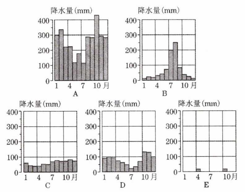 (5)A−−全年多雨型 B−夏季多雨型 C−常年湿润型 D−冬季多雨型 E−全年少雨型 点拨:本题考查判读降水量柱状图的能力。读图判断,A图反映出的降水特点是全年多雨,在五幅图中年降水量最多;B图反映出的降水特点是夏季多雨,冬季少雨;C图反映出的降水特点是全年降水均匀,各月降水量在50~100毫米之间;D图反映出的降水特点是冬季多雨,夏季少雨;E图反映出的降水特点是全年少雨。