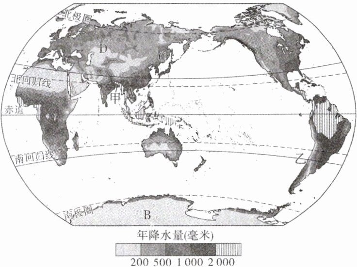 毫米以上。(3)B 图的各月降水量很不均匀,降水量最多出现在