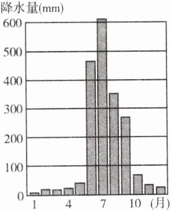 (3)B 图的各月降水量很不均匀,降水量最多出现在