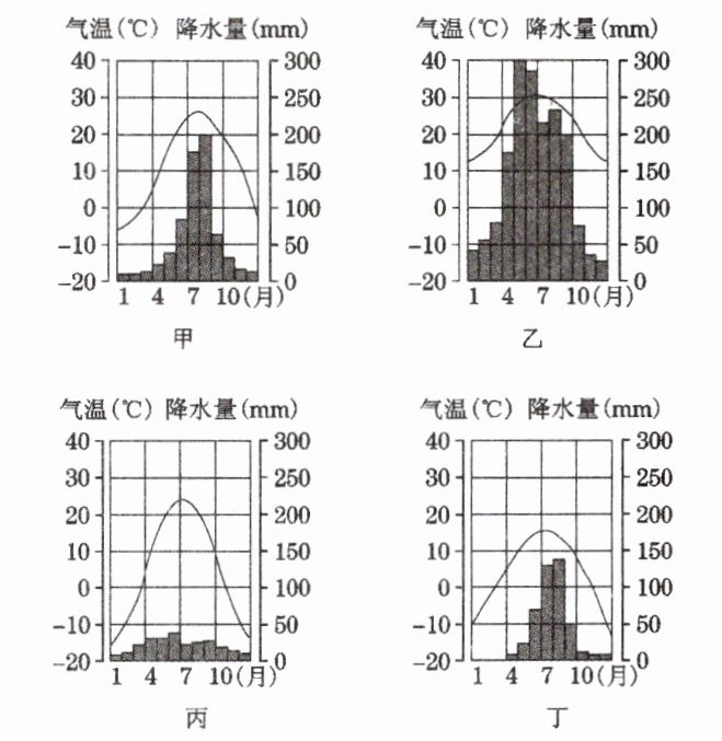 A 点拨:甲图1月份的气温低于0℃,7月份的气温高于25℃;降水量季节分配不均匀,主要集中在夏季,冬季降水量很少,符合条件。故选A。