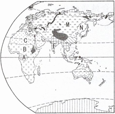 (1) 写出下列字母所在地的气候类型名称: