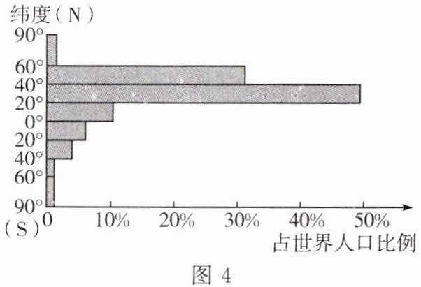 。(3)纬度与人口分布。由图 4 可知,世界人口大部分位于