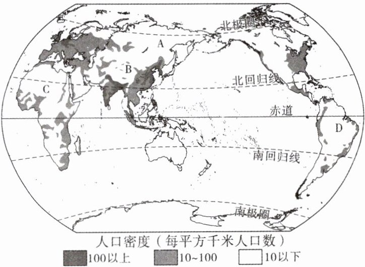 17. 世界人口的分布很不均匀,人口增长的地区差异很大。读“世界人口分布图”,回答下列问题。