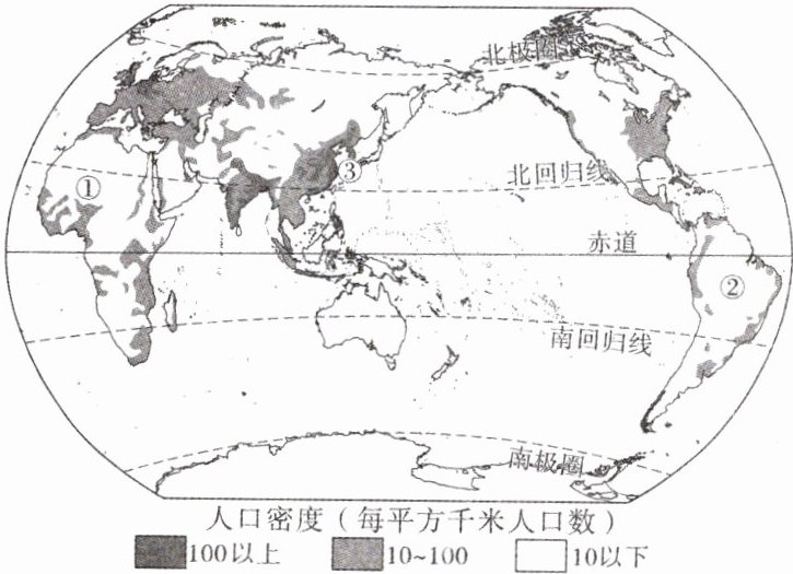 。(3)由分析上题中①②③地的人口密度可见,影响世界人口分布稀疏与稠密最密切的因素是(