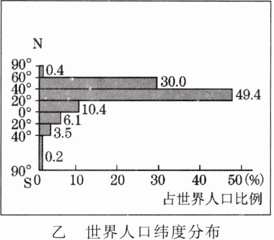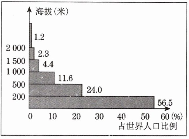 (1)分析图甲,从地形类型来看,世界 56%左右的人口分布在海拔 200 米以下的