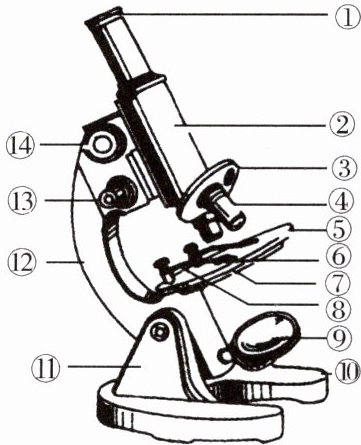 13. 观察单目显微镜,填出各部分在图中的位置和名称。