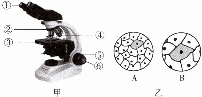 (2)在显微镜下观察到图乙 A 视野,若想进一步观察阴影部分的细胞,需要将装片向______方移动,换成高倍物镜后,转动显微镜的[ ]______,可清晰看到 B 视野。比较图乙视野 A 和视野 B,其中细胞放大倍数较大的是______,同样光源下视野相对较暗的是______。
