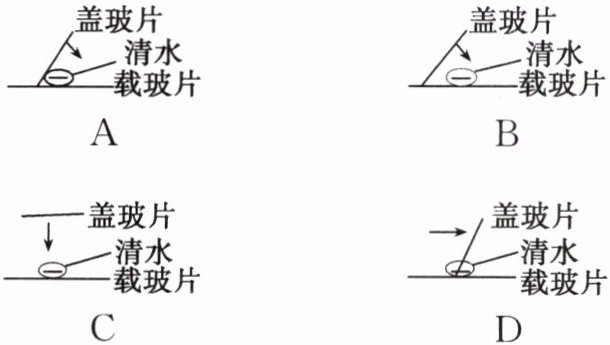 2. 制作洋葱表皮临时装片时,盖上盖玻片的操作方法如图所示,其中正确的是(图中撕下的洋葱表皮已经展平在清水中,箭头表示盖上盖玻片的方向,椭圆表示载玻片中央的清水)( )