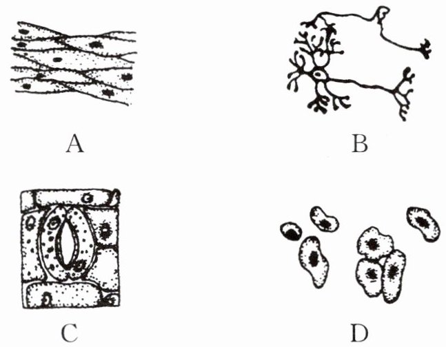 C 点拨:题述三种细胞中,只有苦草叶肉细胞具有叶绿体,A 不符合题意;洋葱根尖细胞、苦草叶肉细胞、人的肌肉细胞都具有细胞膜、细胞质和细胞核,B、D 不符合题意;洋葱根尖细胞、苦草叶肉细胞具有细胞壁,人的肌肉细胞没有细胞壁,C 符合题意。